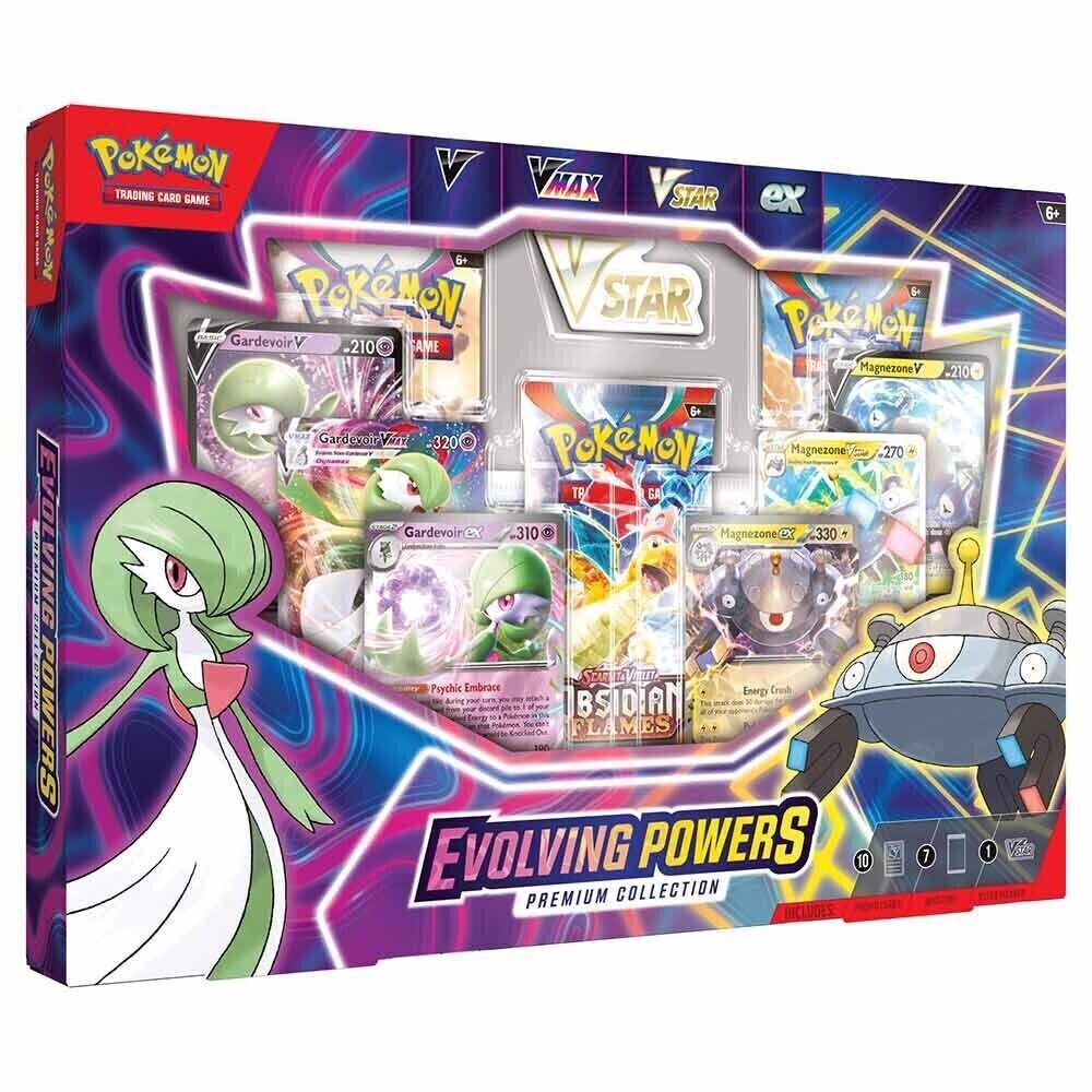 Go beyond your limits with Magnemite and Ralts in the Pokémon TCG: Evolving Powers Premium Collection! In this mighty box full of goodies, these two Pokémon are ready to battle by your side. Push through the opposition, and you’ll be able to evolve them all the way to Magnezone and Gardevoir—as Pokémon ex! If that’s not enough evolutionary power, Magnezone V and Gardevoir V also join the fray, with the potential to evolve into Magnezone VSTAR and Gardevoir VMAX. Just when you thought it was over, you also get 7 Pokémon TCG booster packs to round out this very exceptional party!